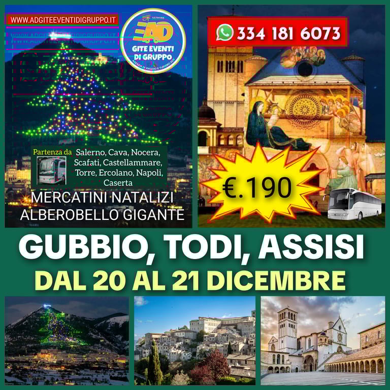 ✔️ Partenza dai luoghi prestabiliti sosta durante il viaggio per prima colazione arrivo a GUBBIO, con visita al bellissimo centro storico e mercatini Natalizi, accensione dell'albergo gigante, con pranzo libero, in serata raggruppo dei partecipanti e spostamento in Hotel a TODI, sistemazione delle camere riservate con cena e visita al bellissimo centro storico, rientro in hotel per il pernottamento.