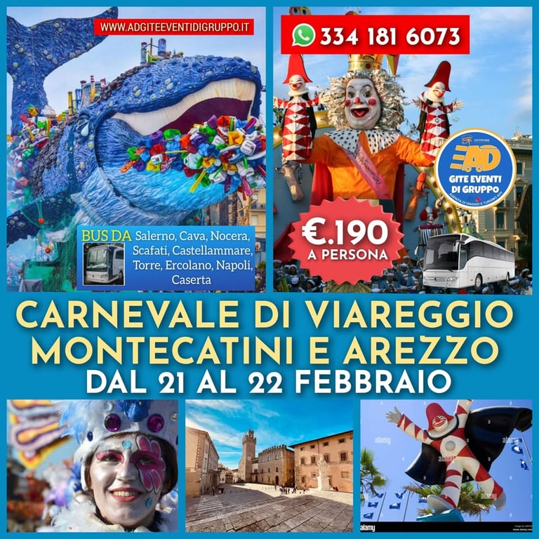 ✅️Partenza dai luoghi prestabiliti sosta durante il viaggio per prima colazione, arrivo a Montecatini Terme, sistemazione delle camere riservate con pranzo in Hotel, dopo pranzo partenza per VIAREGGIO per assistere alla bellissima sfilata del carnevale di VIAREGGIO con tanto divertimento con cena libera, in serata Spostamento a MONTECATINI TERME rientro in Hotel per il pernottamento pernottamento.