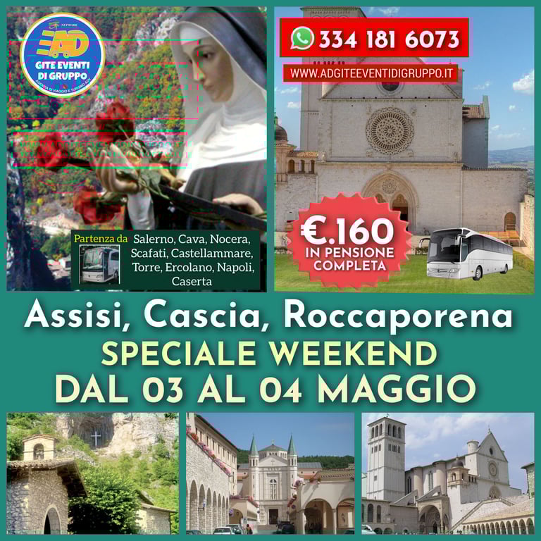 ✅️Sveglia e colazione in hotel mattinata visita escursione varie alla chiesa di santa Rita e il monastero con visita guidata all'interno, rientro in hotel per il Pranzo, in pomeriggio carico bagagli e partenza per Roccaporena paese nativo di santa Rita visita libera, in serata raggruppo dei partecipanti per il rientro previsto in serata.