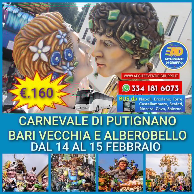 ✅️Sveglia e colazione in hotel carico bagagli e partenza per PUTIGNANO per il bellissimo carnevale Assistente al magnifico carnevale di Putignano 🎊 con tanto divertimento, in pomeriggio raggruppo dei partecipanti per il rientro previsto in serata.