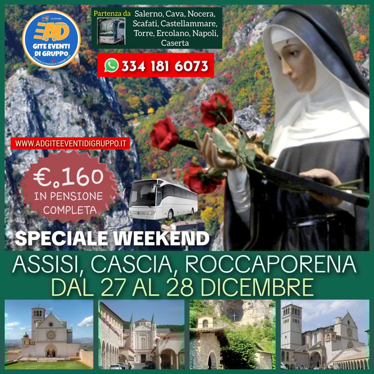🚍Partenza dai luoghi prestabiliti, sosta durante il viaggio per prima colazione arrivo in mattinata ad "ASSISI" Visita al bellissimo centro storico, con visita alla chiesa ⛪️ di santa chiara, Carlo acutis e la chiesa ⛪️ di San Francesco D'Assisi (Pranzo libero) in pomeriggio raggruppo dei partecipanti e spostamento a "ROCCAPORENA " Paese nativo di "SANTA RITA" Visita ed escursioni varie, in serata Spostamento in hotel sistemazione delle camere riservate con cena e pernottamento.
